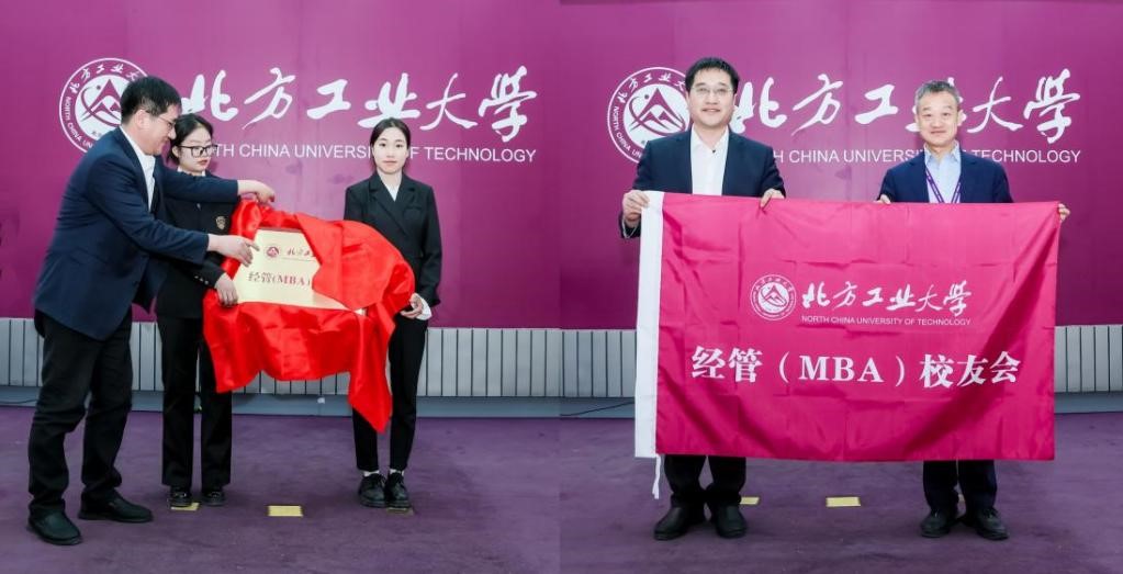 副校长李全明为经管(MBA)校友会揭牌并授旗,学院党委书记谢朝阳、院长赵继新为理事会成员颁发聘书。