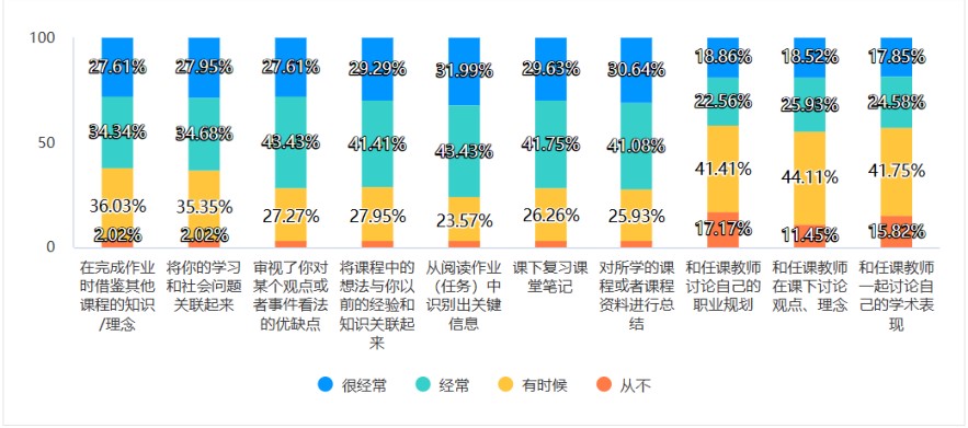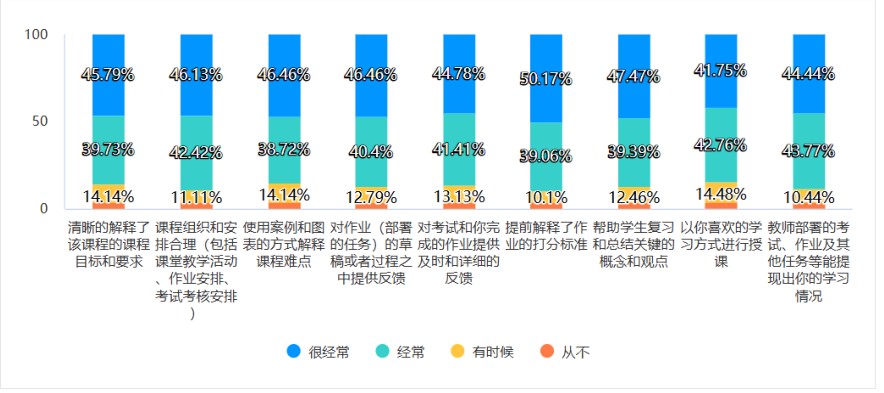 当然,相关测试报告也为学院教师今后教学改进提出了努力方向,学生满意度调查报告显示,任课教师与学生讨论职业规划、讨论观点理念等频度稍低,不足50%。
