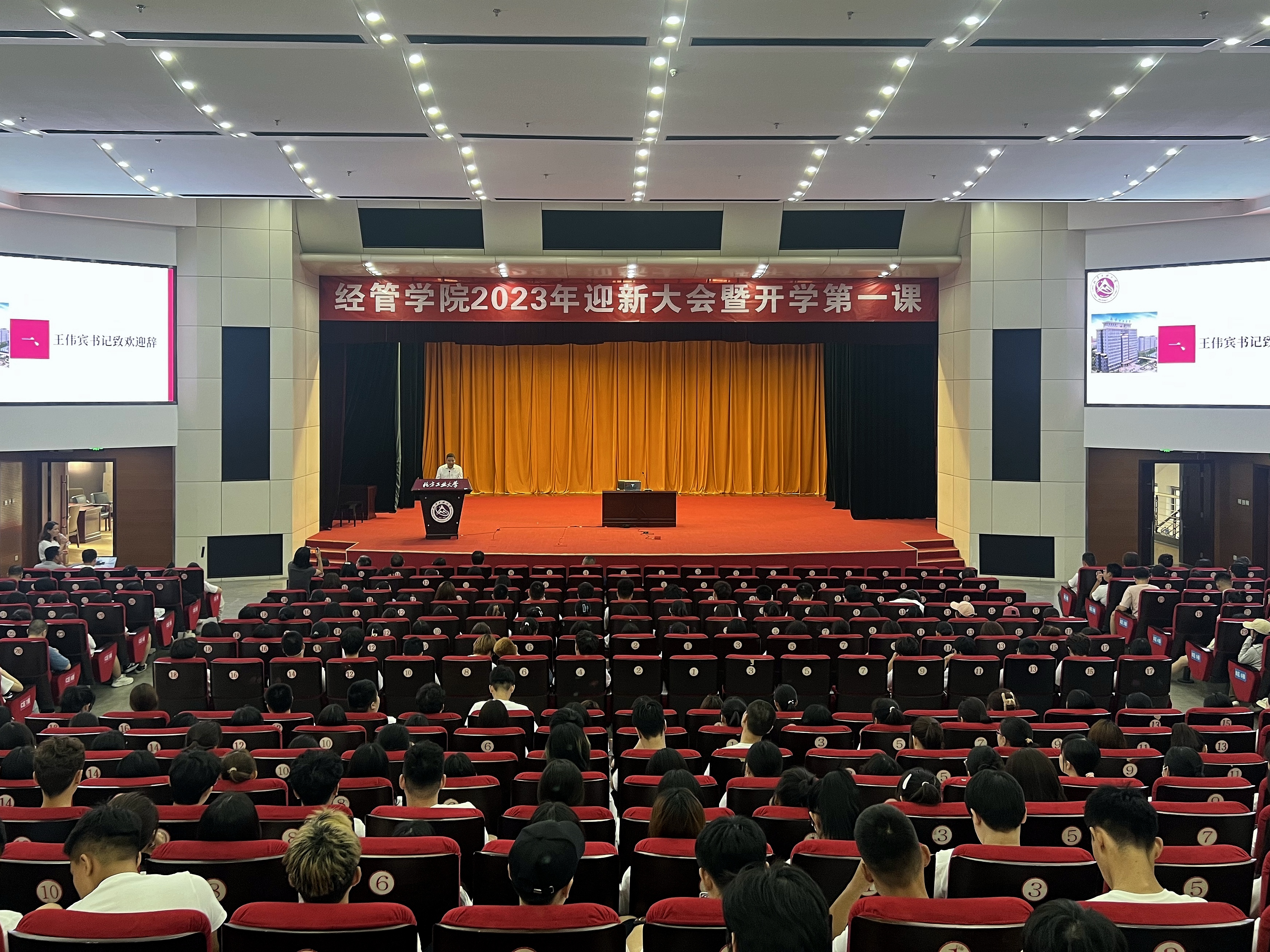 首先,学院党委书记王伟宾致欢迎辞,对全体新生的到来表示欢迎,祝贺同学们走向新的奋斗起点。他简要回顾了学院的发展历史、特色优势、师资力量、人才培养目标、校友风采等方面内容,勉励同学们不负韶华,刻苦学习,早日成为优秀的工大学子。