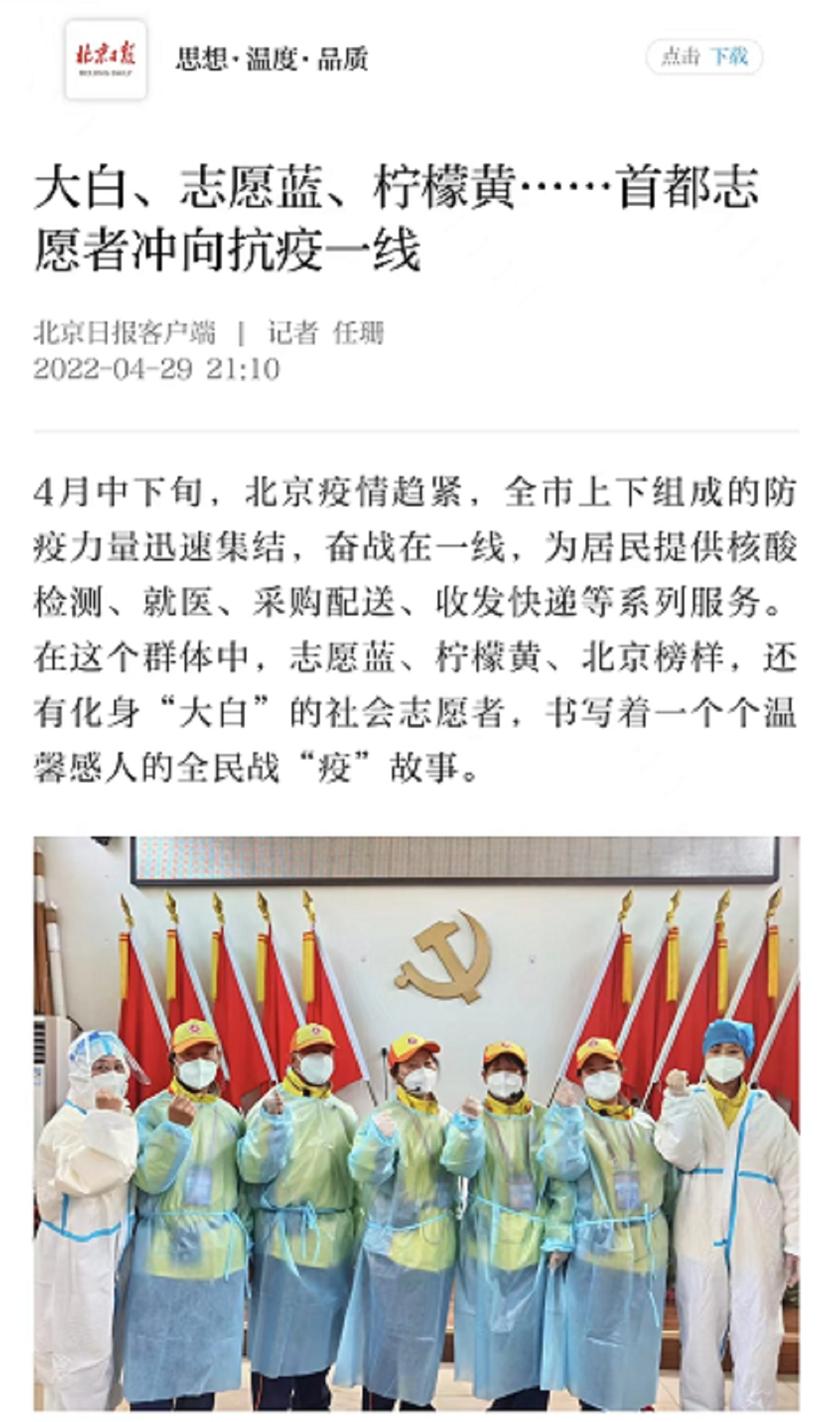 2022年全国和北京疫情防控形势严峻复杂,KY开元集团学生积极响应国家和学校号召,主动担当作为,投身所在社区、乡镇或街道的志愿服务工作,涌现出一批积极参与疫情防控志愿服务的“红马甲”和“大白”。他们用青春镌刻责任与担当,用坚持、坚守、坚定守护人民健康,展示了北方工大学子的责任与担当,抗疫事迹被人民网、北京日报等媒体报道。