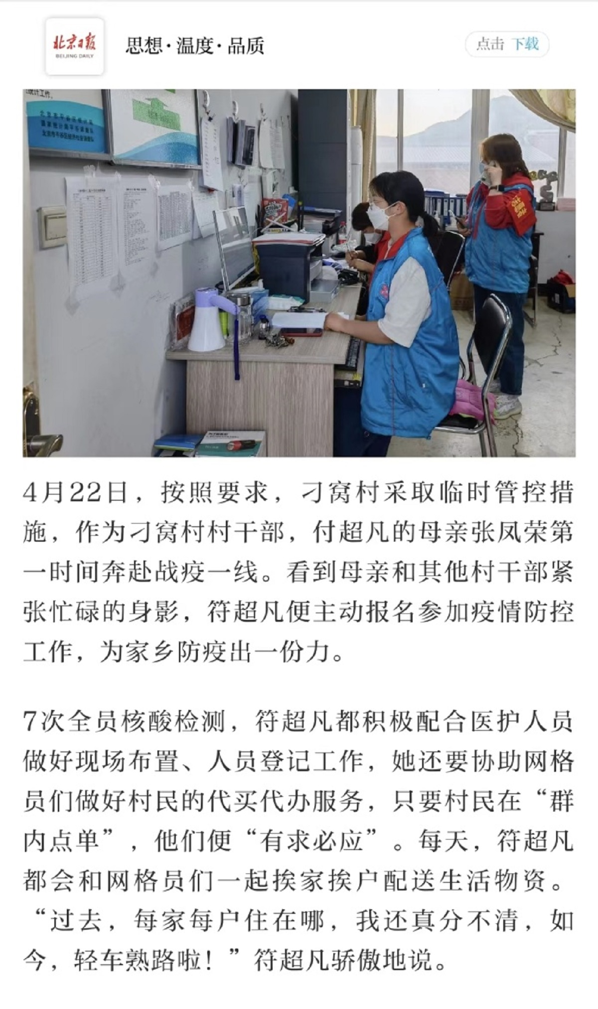 会21-2班符超凡同学,是北京平谷区刁窝村的一名大学生,得知所在社区临时管控的消息后,主动请缨,与作为村干部的母亲一道第一时间奔赴抗疫一线,参加疫情防控志愿服务工作。自4月22日起,她每天积极配合医护人员做好现场布置、人员登记工作,协助网格员们做好村民的代买代办服务,只要村民在“群内点单”,他们便“有求必应”。十多天来,她和网格员们一起挨家挨户配送生活物资。“过去,每家每户住在哪,我还真分不清,如今,轻车熟路啦!”符超凡骄傲地说。她的事迹也先后在北京日报、人民网被报道。在接受北京日报采访时,她这么说道“能有机会和妈妈一起并肩抗疫,感觉很光荣,也很自豪。这几天虽然很累,但是跟日夜坚守的医护人员比,真的不算什么!”