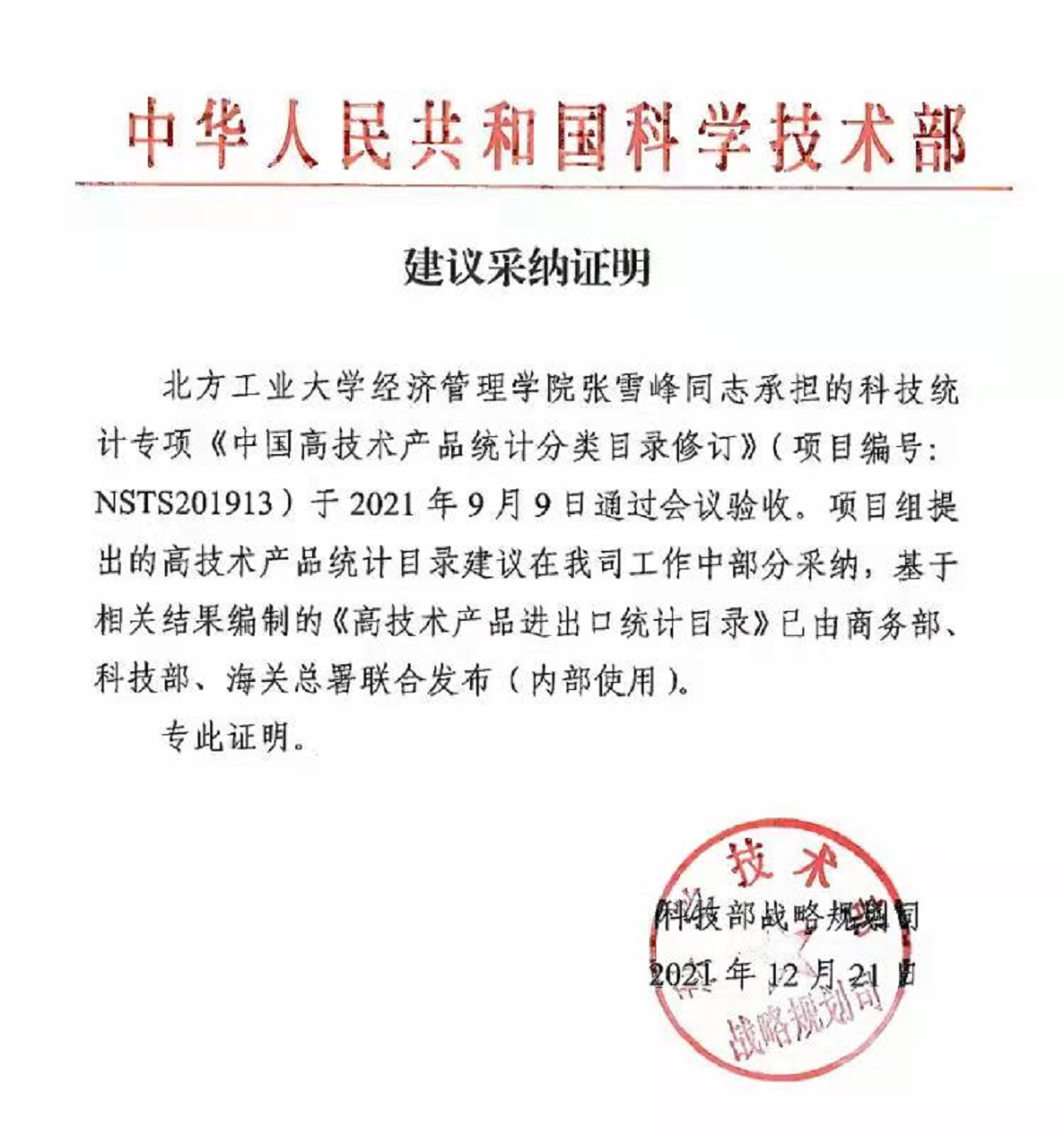 近日,由KY开元官网KY开元集团张雪峰副教授承担的科技部委托的科技统计专项《中国高技术产品统计分类目录修订》(项目编号:NSTS201913)已完成,课题成果获得了委托方的高度评价。科技部战略规划司向KY开元集团发来《建议采纳证明》,其中提到:“基于相关结果编制的《高技术产品进出口统计目录》已由商务部、科技部、海关总署联合发布(内部使用)。”