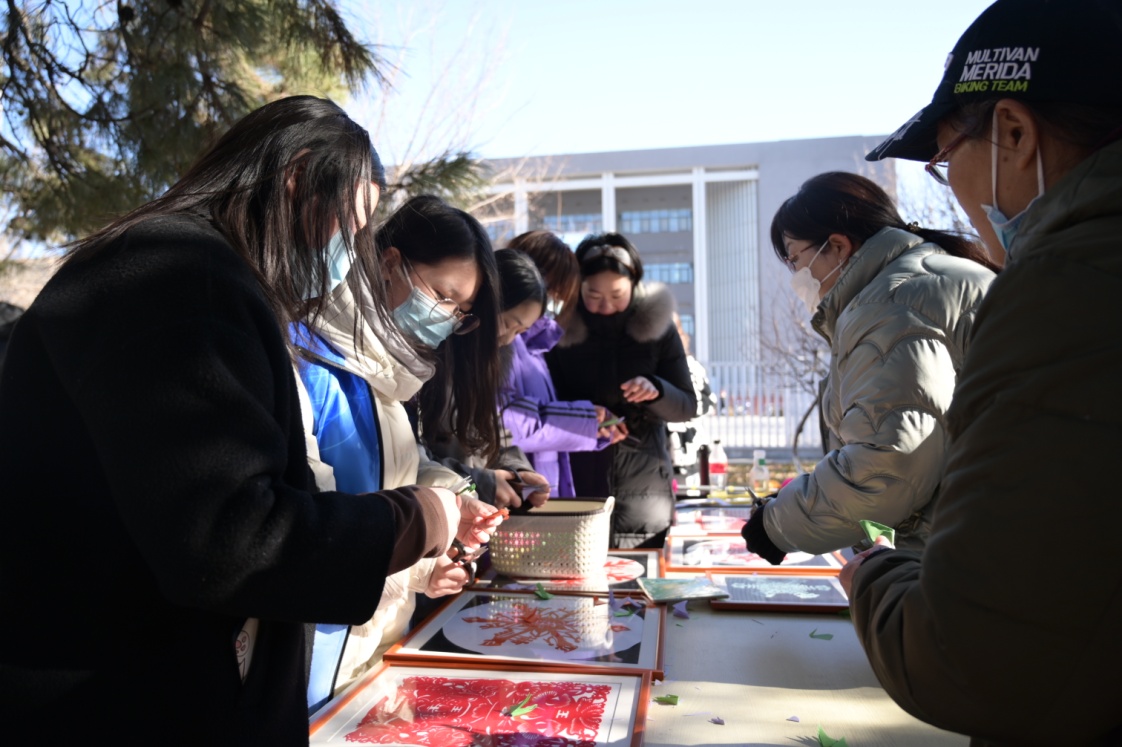 在剪雪花、送祝福、迎冬奥活动环节,一幅50米长的画卷吸引众多师生驻足观看,画卷共分5个部分,既有非遗传承人通过剪纸技艺展现的冬奥比赛场地和比赛项目,又有历届冬奥会的会徽标识,既展现了非遗传统技艺,又普及了冬奥知识。现场,石景山区剪纸第四代非遗传承人杨秀英老师与师生互动,传授剪纸技艺。过往师生体验剪雪花等非遗项目,并将个人剪好的雪花贴到画卷上,以表达喜迎冬奥之情。师生们通过录制祝福视频和在朋友圈祝福接力等形式,纷纷送出个人的冬奥祝福,现场气氛热烈。活动中,在石景山区非物质文化遗产保护中心的支持下,展示了石景山区非遗项目,师生体验空竹和花棍等非遗项目。