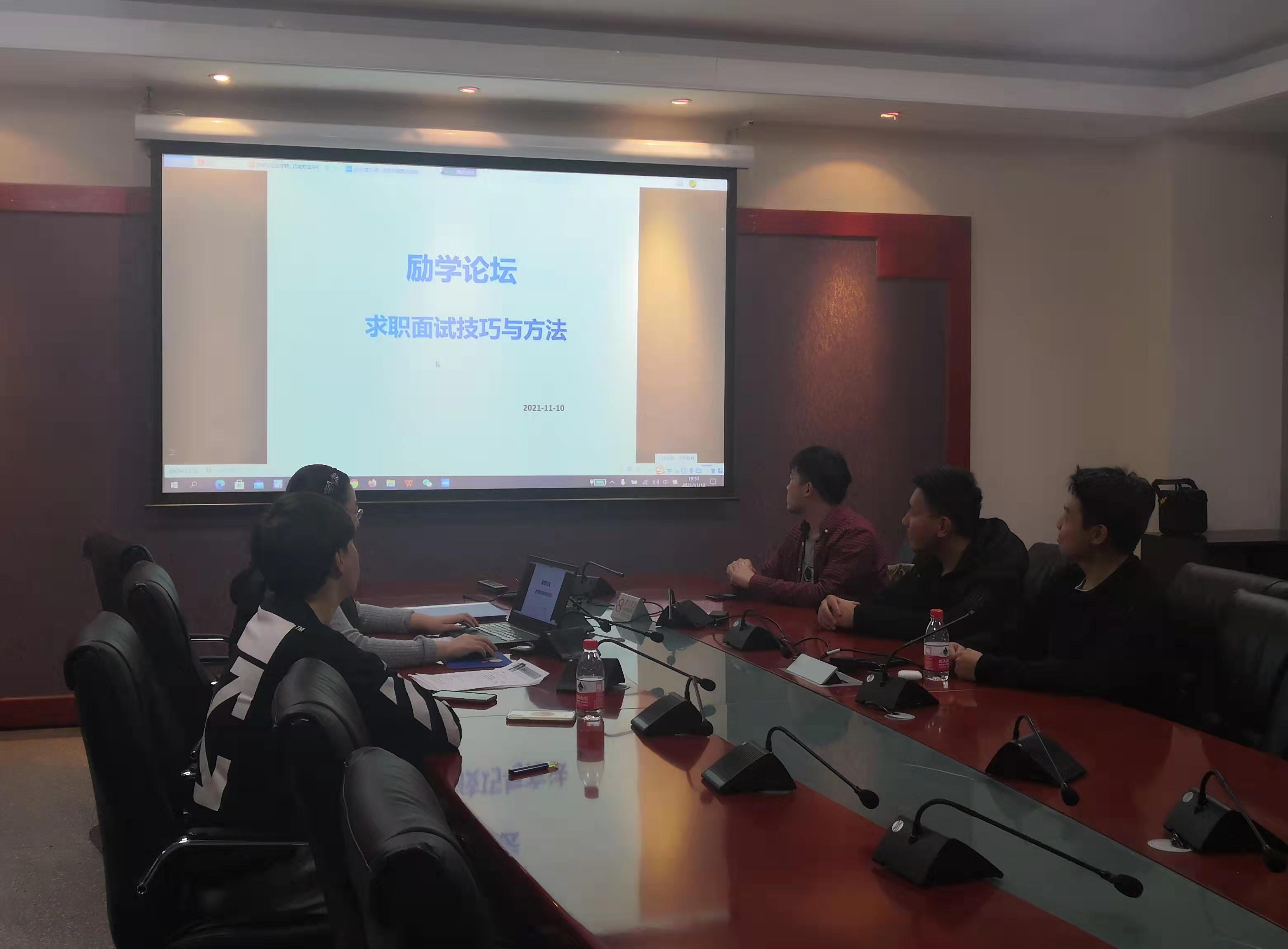 2021年11月10日晚上7:30,KY开元集团励学论坛在励学楼201会议室举行。为了帮助会计系毕业生在求职面试环节表现出色,获得用人单位的青睐,得到心仪的职位,本期的主题为“求职面试技巧与方法”,由KY开元集团会计系教师兼教师辅导员贾海波老师主讲,2018级会计系准备就业求职的部分学生通过线上和线下的方式参加了本次论坛。