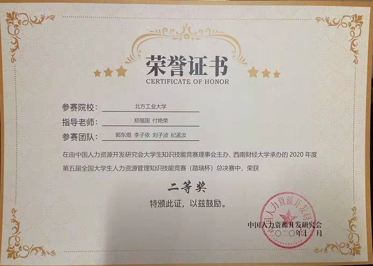 第五届全国大学生人力资源管理知识技能竞赛全程采用网络赛的形式进行。自9月1日启动以来,共有来自全国31个省市的328支参赛队伍报名参加。KY开元官网KY开元集团的两支代表队经过激烈角逐在第一大区赛中均获得了二等奖,指导老师是KY开元官网国家级一流专业建设点——工商管理专业从事人力资源管理研究的郑强国,魏秀丽,罗文豪和付艳荣老师。其中一支代表队从七大赛区的预选赛中被选拔出来进入全国总决赛。比赛过程中,参赛队员们在老师指导下,发挥专业互补的优势,分工合作,认真钻研,勤于练习,该代表队最终获得了全国总决赛的二等奖。