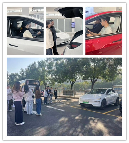 同学们在企业方老师的带领下参观了特斯拉中心展出的特斯拉前沿技术和储能充电设备,并深入体验辅助驾驶功能。随后,同学们观看特斯拉灯光展,通过汽车软件与硬件交互的便捷性了解特斯拉发展现状。