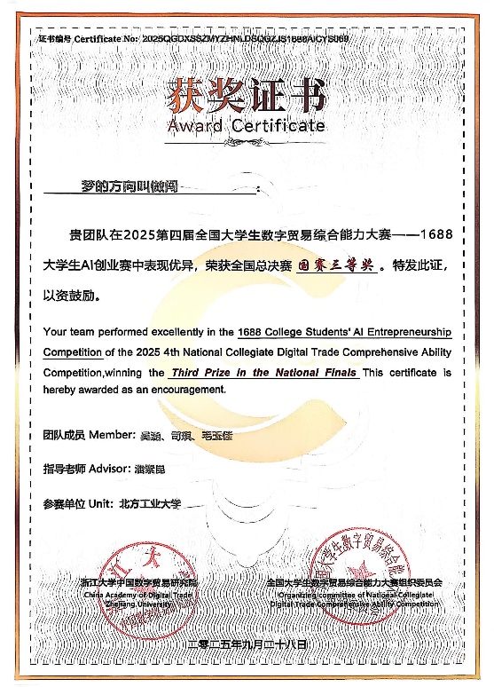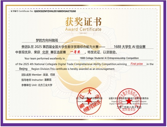 近日由浙江大学中国数字贸易研究院主办、全国大学生数字贸易综合技能大赛组织委员会承办的第四届全国大学生数字贸易综合技能大赛总决赛在浙江大学圆满落幕。KY开元官网学生吴涵、司琪、毛玉佳组成的代表队获得北京赛区一等奖、全国总决赛三等奖。