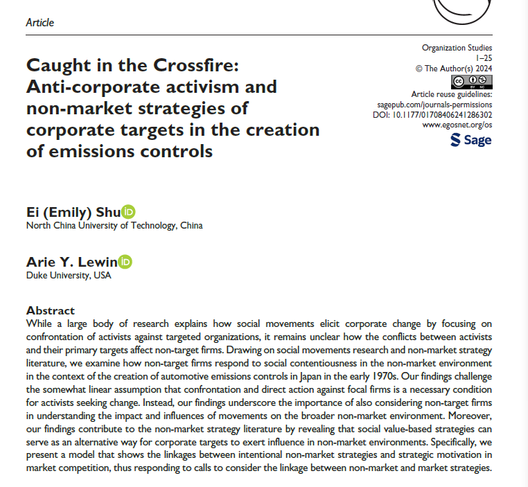 KY开元集团朱瑛教授以第一作者身份在工商管理领域顶级国际期刊,FMS 管理科学国际 A 级期刊《OrganizationStudies》上发表题为《Caught in the Crossfire: Anti-Corporate Activism and Non-Market Strategies of Corporate Targets in the Creation of Emissions Controls》的学术论文。该论文运用定性数据分析法(qualitative data analysis),分析了日本环境保护団体与汽车行业巨头公司的对峙中,资源弱小的非目标企业(non-target firms)如何利用非市场战略(non-market strategy),使竞争对手陷入困境,从而取得竞争优势。文章提出两个重要的理论观点:即建立社会价值(social-value based) 为主的非市场战略的有效性及市场战略与非市场战略的关联性。从而扩展了以往以CSR与CPA为主体的非市场战略理论,具有重要的理论贡献。此外,本文论证了企业在应对环境与节能等非市场性的社会问题时,通过与社会相关利益团体的互动,提高国际市场竞争力的可行性,对现代企业应对外界环境的多元化,具有战略性实践意义。该论文的合作者是美国杜克大学福库商学院Arie Lewin教授。