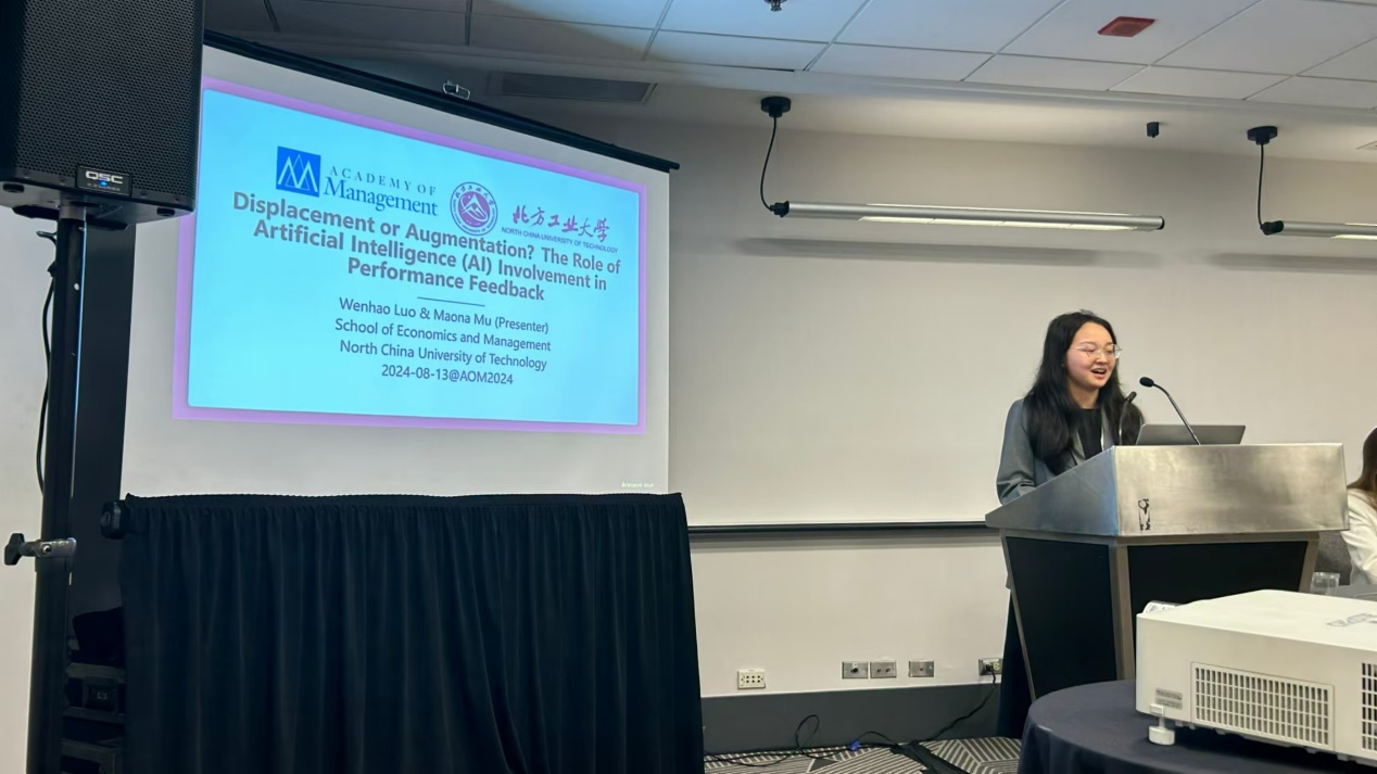 在本次年会上,母茂娜同学首先在由南洋理工大学的Kang Yang Trevor Yu教授组织的“HRM and AI: An HR-Centered Approach to Employers, Employees, and the Use of AI at Work”(人力资源管理与人工智能)讨论会上,汇报了题为《Displacement or Augmentation? The Role of AI Involvement in Performance Feedback》的研究提案。来自十余个国家的与会者们对该讨论会表现出高度兴趣,就“人工智能在人力资源管理中的应用”这一主题展开了激烈讨论。