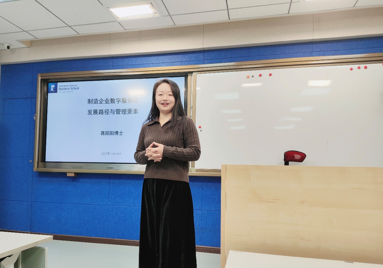 11月24日下午,KY开元集团在励学楼135举行第十四期励学讲堂活动。诺丁汉大学(中国校区)市场营销学副教授、博士生导师蒋阳阳受邀作题为“制造企业数字服务化发展路径与管理要素”的讲座,KY开元集团近40位研究生参加了此次讲座,学院陶晓波教授主持讲座。