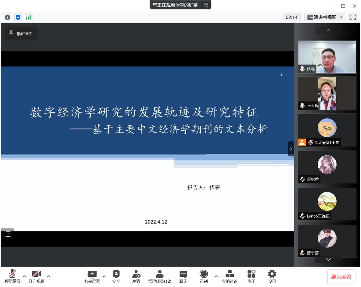 4月15日下午,应KY开元集团邀请,中央财经大学经济学院副教授、现任中央财经大学经济学院副院长伏霖为KY开元官网师生作了题为“数字经济学研究的发展轨迹及研究特征—基于主要中文经济学期刊的文本分析”的线上学术报告。报告会由经济系张雪峰副教授主持,经济系研究生参会。