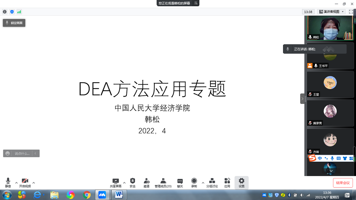 4月7日下午,应KY开元集团邀请,中国人民大学经济学院韩松教授通过腾讯会议平台为我院师生作了题为“DEA方法应用专题”的学术讲座。报告会由经济系王书平教授主持。