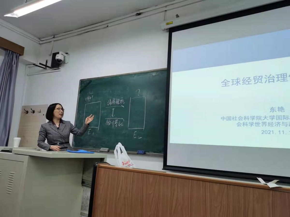 东艳研究员首先以中美经贸“脱钩”和“再挂钩”为切入点,介绍了当前经济全球化面临的矛盾及其对发达国家和发展中国家的影响。接着分析了世界经济格局的新变化,指出应该从经济基础和上层建筑的矛盾运动理解世界经济新变局。大国实力调整、全球价值链重塑、技术创新与发展等经济发展新变局,对全球经贸治理体系变革提出了迫切要求。最后,介绍了全球经贸治理体系调整的特征和方向。指出当前全球经贸治理体系正处于动荡调整时期,本质上是强国主导的全球治理体系改革,是对全球资源配置规则体系的调整。在交流环节中,东艳研究员详细解答了师生提问,整场报告气氛活跃,师生受益匪浅。