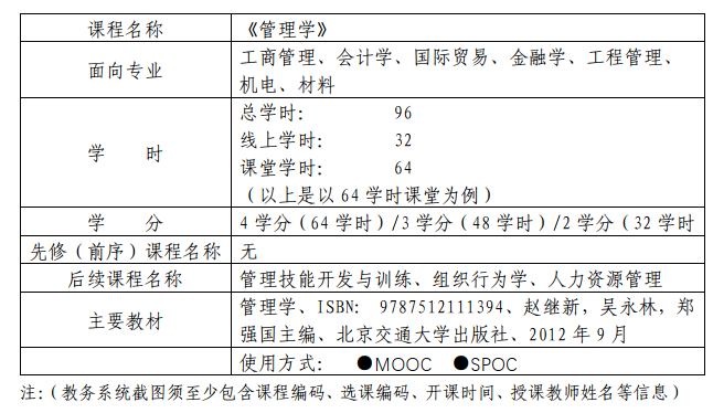 本课程是经济管理学学院的院级平台课,学校和学院两级一直持续对本课程进行建设,发展历程分为三个阶段:(1)平台课建设。这一时期的建设主要以完善线下的管理学的教学内容和教学方式、考评方式为主。(2)利用学校的多模式教学网和蓝墨云班课进行线上和线下教学的初步尝试。(3)开发了管理学MOOC。管理学的在线课程于2019年9月上线中国大学慕课网,同时开始了线上和线下混合式教学的真正实践。