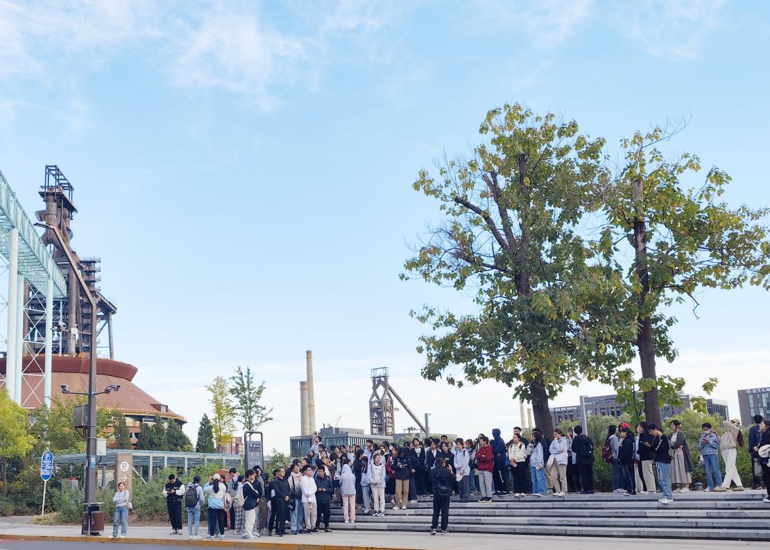 随后,师生一行在讲解员的带领下认真参观了冬奥组委办公区外围和秀池周边区域,沿途远观三高炉、焦化厂、氧气厂等工业遗产,深入了解首钢百年以来的光辉历史和北京冬奥会筹办历程。新首钢因冬奥而兴,使百年首钢实现华丽转身,成为“一起向未来”的城市复兴新地标。大家纷纷在网红打卡地前合影留念,深切感受到工业遗存的魅力所在,见证了百年首钢的岁月变迁与伟大转型。