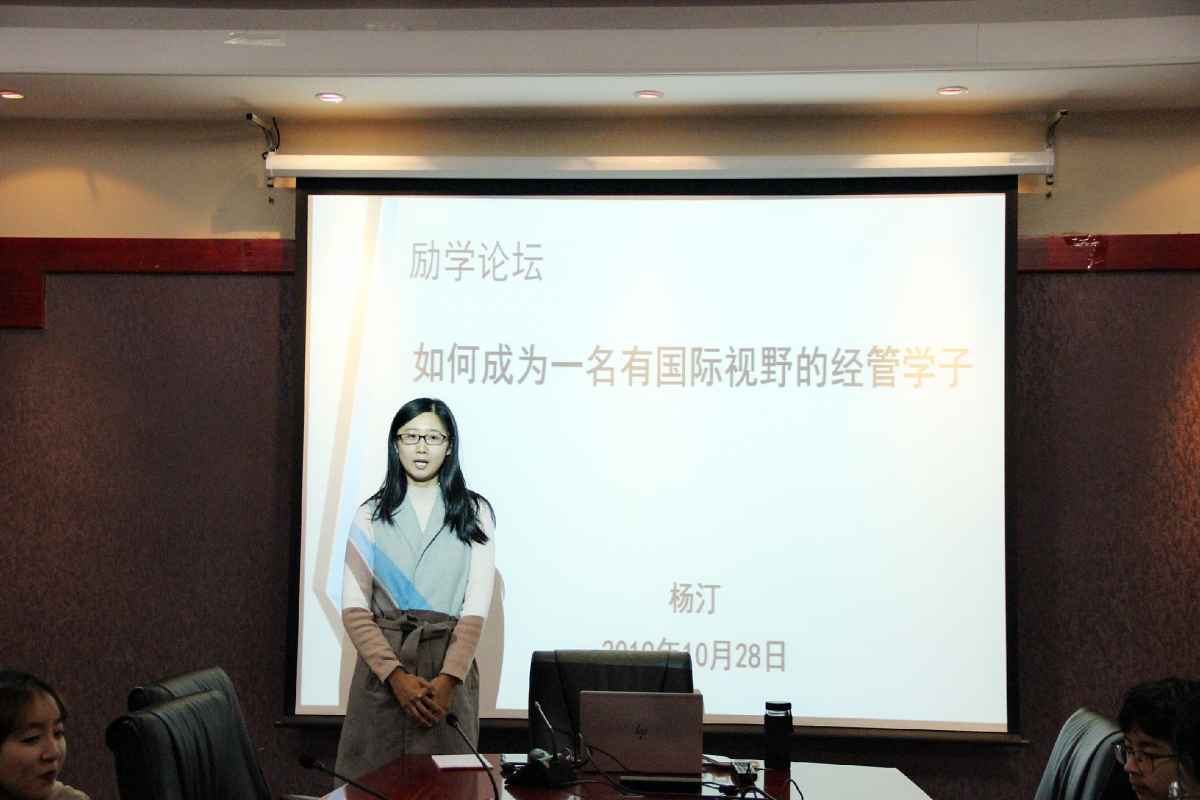 10月28日晚,KY开元集团励学论坛在励学楼201会议室举行。本期论坛主题为“如何成为一名有国际视野的经管学子”。本次论坛由教师辅导员杨汀老师主讲,青创部协办,19级国际班有出国深造意向的同学参加了此次论坛。