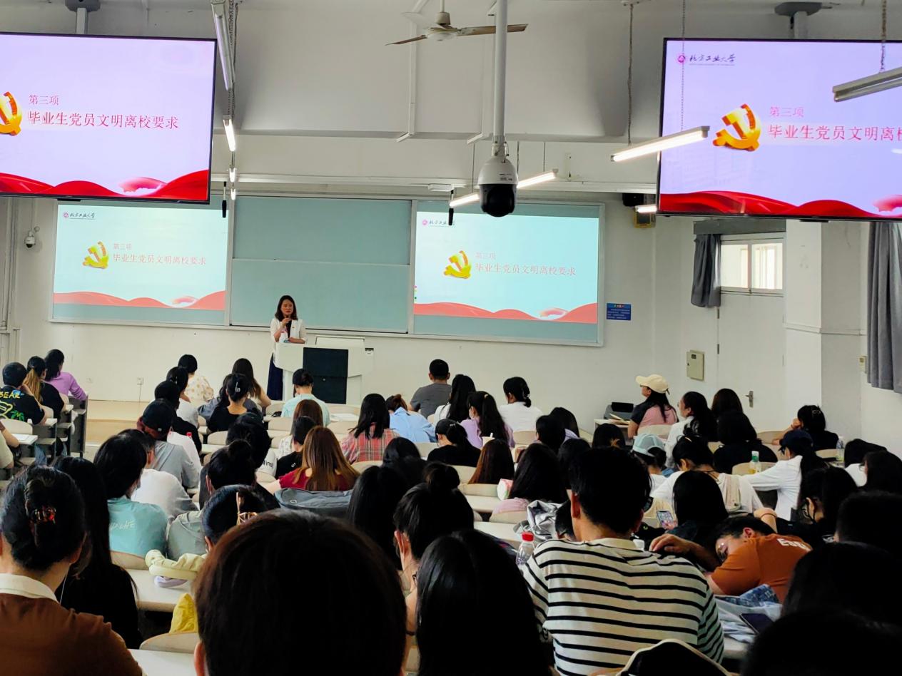 学院党委副书记王帏对毕业生党员文明离校提出了三点要求,第一,要求毕业生党员要时刻牢记自己的党员身份,增强学生党员的自律意识,起好模范带头作用,身体力行,带动身边同学文明离校。第二,各位毕业生党员要坚定信仰,牢记自己的入党初心,与时俱进,将实现个人价值与社会发展、国家民族前途命运相统一,树立正确的就业观念,主动适应市场需求。第三,要自觉积极融入新的党组织,避免离校即离党,保持高度的组织纪律性,保持党员的先进性,永葆党员的政治本色,在未来的工作中砥砺前行,开启人生新篇章。