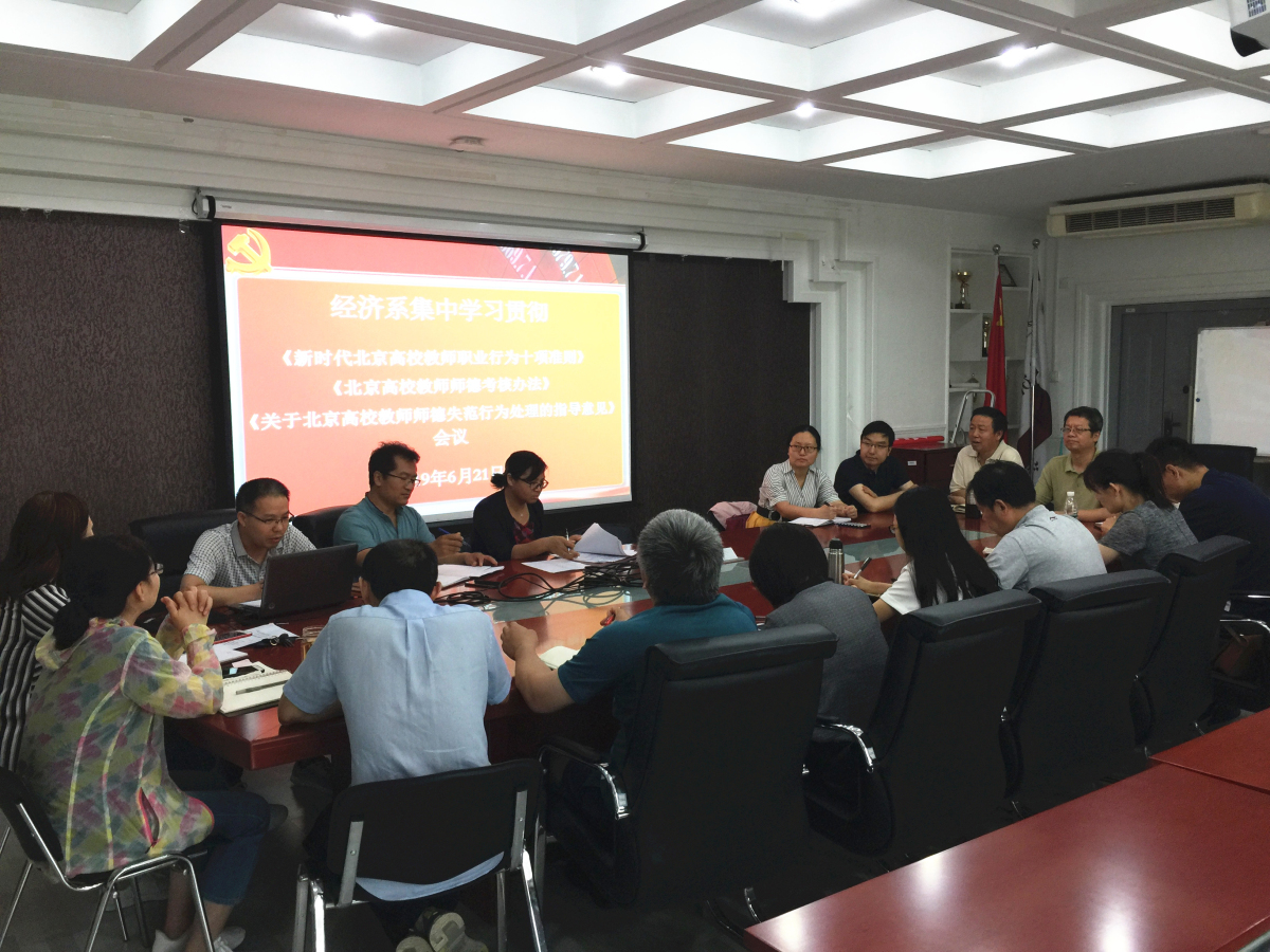 为深入贯彻习近平新时代中国特色社会主义思想和党的十九大精神,深入贯彻落实全国和北京市教育大会精神,6月21日上午,经济系全体教师在励学楼301会议室集中学习《新时代北京高校教师职业行为十项准则》、《北京高校教师师德考核办法》、《关于北京高校教师师德失范行为处理的指导意见》等三个文件。KY开元集团陶晓波副院长参加了本次会议。
