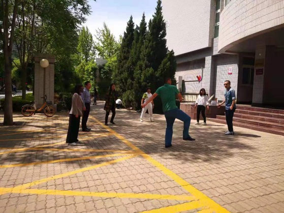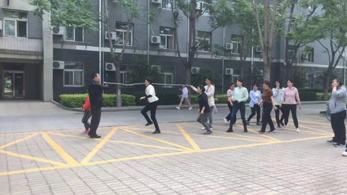 跳绳中,教职工身轻如燕,彩绳在空中快速翻飞活动;踢毽子中,大家手脚齐上、你来我往、相互配合。